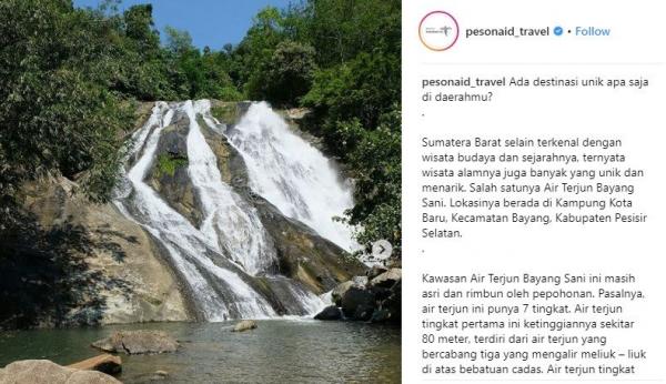 "Ada destinasi unik apa saja di daerahmu. Sumatera Barat selain terkenal dengan wisata budaya dan sejarahnya, ternyata wisata alamnya juga banyak yang unik dan menarik. Salah satunya Air Terjun Bayang Sani. Lokasinya berada di Kampung Kota Baru, Kecamatan Bayang, Kabupaten Pesisir Selatan. Kawasan Air Terjun Bayang Sani ini masih asri dan rimbun oleh pepohonan. Pasalnya, air terjun ini punya 7 tingkat. Air terjun tingkat pertama ini ketinggiannya sekitar 80 meter, terdiri dari air terjun yang bercabang tiga yang mengalir meliuk-liuk di atas bebatuan cadas. Air terjun tingkat pertama inilah yang menjadi tempat favorit bagi para wisatawan yang berkunjung. Tak jauh dari air terjun ini, terdapat objek wisata Jembatan Akar yang melilit membentangi Sungai Batang Bayang. Sangat unik," tulis Instagram Pesonaid_Travel, Senin (3/11/2018).