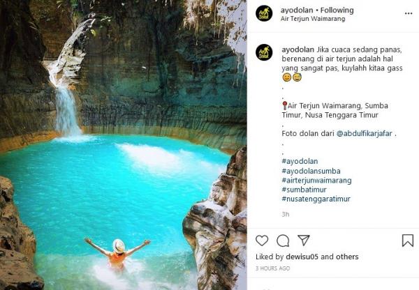 "Jika cuaca sedang panas, berenang di air terjun adalah hal yang sangat pas, kuylahh kita gass. Air Terjun Waimarang, Sumba Timur, Nusa Tenggara Timur. Foto dolan dari @abdulfikarjafar," tulis Instagram @ayodolan, dikutip Kamis (11/6/2020).