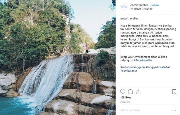 "Nusa Tenggara Timur, khususnya Sumba, tak hanya terkenal dengan destinasi padang rumput atau pantainya. Air terjun merupakan salah satu keindahan alam tersembunyi di Sumba yang masih belum banyak terjamah oleh para wisatawan. Nah salah satunya ini gengs, Air Terjun Tanggedu. Keep your environment clean & keep relying on #Entertraveller," tulis Instagram @Entertraveller, dikutip Rabu (30/1/2019).