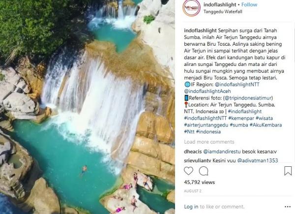 "Serpihan surga dari Tanah Sumba, inilah Air Terjun Tanggedu airnya berwarna Biru Tosca. Aslinya, saking bening Air Terjun ini sampai terlihat dengan jelas dasar airnya. Efek dari kandungan batu kapur di aliran sungai Tanggedu dan mata air dari hulu sungai mungkin yang membuat airnya menjadi Biru Tosca. Semoga tetap lestari," tulis Instagram @Indoflashlight, dikutip Sabtu (11/8/2018).
