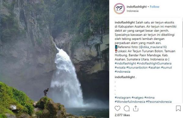 "Salah satu air terjun eksotis di Kabupaten Asahan. Air terjun ini memiliki debit air yang sangat besar dan jernih. Spesialnya, kawasan air terjun ini dikelilingi oleh tebing seperti lembah dengan perpaduan alam yang masih asri," tulis Instagram @indoflashlight, Rabu (6/3/2019).