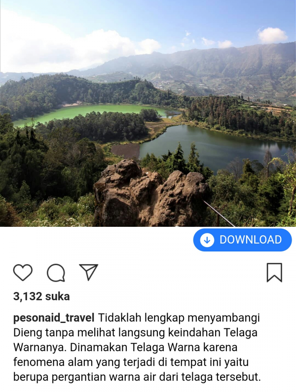 "Anda juga bisa menyaksikan letupan air mendidih di tengah telaga, seperti yang ada di Kawah Putih (Jawa Barat). Harmonisasi alam dengan udara sejuk dan bersih membuat suasana Telaga Warna Dieng begitu memikat. Suasana mistis yang hening pun disempurnakan oleh kabut putih dan pepohonan yang melingkupinya. Kapan mau berkunjung ke sini?" tulis Instagram @Pesonaid_travel, dikutip Senin (26/8/2019).