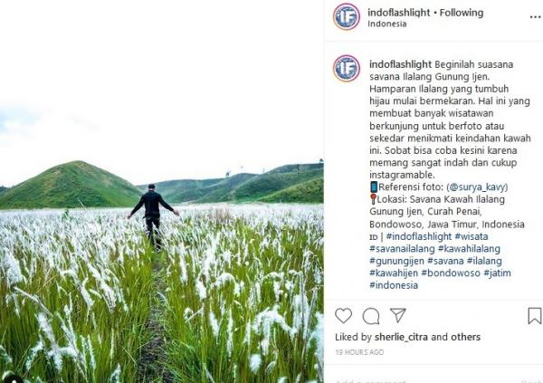 "Beginilah suasana savana Ilalang Gunung Ijen. Hamparan Ilalang yang tumbuh hijau mulai bermekaran. Hal ini yang membuat banyak wisatawan berkunjung untuk berfoto atau sekadar menikmati keindahan kawah ini. Sobat bisa coba ke sini karena memang sangat indah dan cukup Instagramable," tulis Instagram @indoflashlight, dikutip Kamis (2/1/2020).