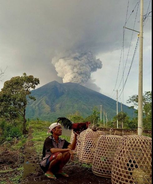 Anda bisa melihat di foto ini, seorang penduduk lokal terlihat santai mengurus ayamnya. Padahal, asap tebal telah keluar dari puncak Gunung Agung.