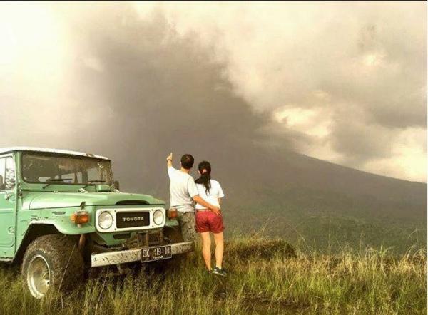 Pasangan sejoli ini, malah terlihat lebih dekat dengan Gunung Agung. Mereka seperti asyik memandangi Gunung yang sedang mengeluarkan asap panas.