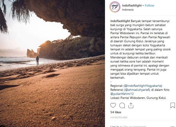 "Banyak tempat tersembunyi bak surga yang mungkin belum sahabat kunjungi di Yogyakarta. Salah satunya Pantai Widodaren ini, pantai ini terletak di antara Pantai Pepuyon dan Pantai Ngrawah di daerah Gunung Kidul. Jaraknya yang lumayan dekat dengan kota Yogyakarta. Tempat ini paling cocok untuk dikunjungi ketika berlibur. Mendengar deburan ombak dan menikmati sunset ketika sore hari adalah momen yang istimewa di pantai ini, apalagi dengan mengajak orang tersayang. Pantai ini juga bisa dijadikan tempat untuk berkemah," tulis Instagram @indoflashlight, dikutip Senin (1/10/2018).