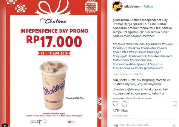 "Chatime Independence Day Promo! Harga spesial Rp17.000 untuk pembelian produk tropical milk tea, berlaku sampai 19 Agustus 2018 di semua outlet, berlaku member atau non-member."
