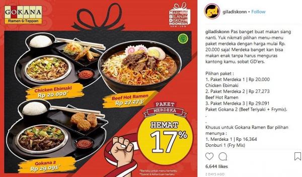 "Pas banget buat makan siang, yuk nikmati pilihan menu-menu paket merdeka dengan harga mulai Rp20.000! Merdeka banget bisa makan enak tanpa harus menguras kantong kamu, sobat GD'ers. Periode promo: 1 Agustus 2018 s/d 15 September 2018."