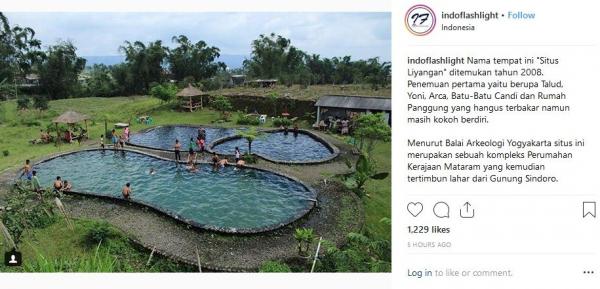 "Nama tempat ini Situs Liyangan, ditemukan pada 2008. Penemuan pertama yaitu berupa Talud, Yoni, Arca, batu-batu candi dan rumah panggung yang hangus terbakar, namun masih kokoh berdiri. Menurut Balai Arkeologi Yogyakarta, situs ini merupakan sebuah kompleks Perumahan Kerajaan Mataram yang kemudian tertimbun lahar dari Gunung Sindoro. Jika sahabat berkunjung ke situs ini, boleh dicoba berendam di Kolam Cinta, airnya dingin dan segar," tulis Instagram @Indoflashlight dikutip, Jumat (19/10/2018).