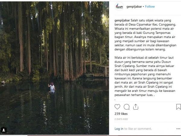 "Salah satu objek wisata yang berada di Desa Cipamekar Kec. Conggeang. Wisata ini memanfaatkan potensi mata air yang berada di kaki Gunung Tampomas bagian timur. Awalnya merupakan mata air yang menjadi sumber air bagi kawasan sekitar, namun saat ini mulai dikembangkan dengan dibangunnya kolam renang. Mata air ini berlokasi di sebelah timur laut dusun yang bernama sama yaitu Dusun Sirah Cipelang. Sumber mata airnya keluar dari bukit kecil yang berada di bawah rimbunnya pepohonan yang memenuhi kawasan ini. Karena langsung bersumber dari mata air, air Sirah Cipelang ini sangat jernih. Air dari mata air Sirah Cipelang ini mengalir ke arah timur menuju ke kawasan pesawahan terhampar luas," tulis Instagram @genpijabar, dikutip Kamis (25/10/2018).