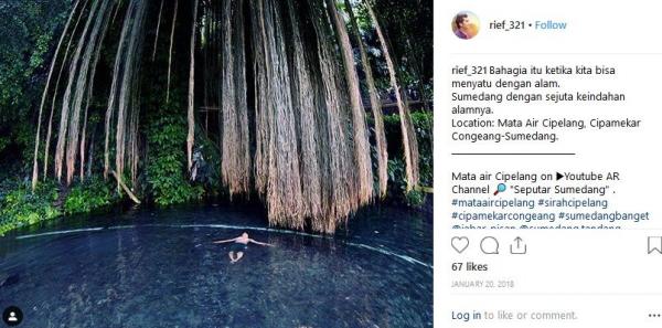 "Bahagia itu ketika kita bisa menyatu dengan alam. Sumedang dengan sejuta keindahan alamnya. Location: Mata Air Cipelang, Cipamekar Congeang-Sumedang," tulis Instagram @rief_321 dikutip, Senin (7/1/2019).