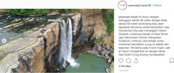 "Air terjun dengan ketinggian sekitar 40 meter dengan lebar sekitar 60 meter berdinding batu alam (geopark) berwarna coklat kemerahan, siap menyambut kita saat menjelajahi Ciletuh Geopark. Lokasinya berada di Desa Taman Jaya, Kecamatan Ciemas, Kabupaten Sukabumi. Uniknya, cara terbaik untuk menikmati keindahan curug ini adalah dari kejauhan. Terutama pada musim hujan, saat air terjun mengalirkan air dengan deras. Saat itulah Curug Awang mendapatkan julukannya, Niagara Mini," tulis Instagram @Indoflashlight, Jumat (21/12/2018).