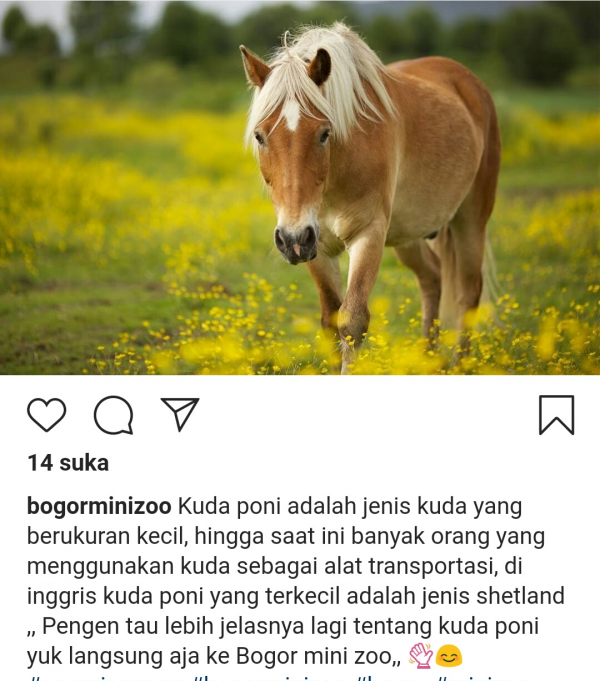 "Kuda poni adalah jenis kuda yang berukuran kecil, hingga saat ini banyak orang yang menggunakan kuda sebagai alat transportasi, di inggris kuda poni yang terkecil adalah jenis shetland. Ingin tau lebih jelasnya lagi tentang kuda poni yuk langsung aja ke Bogor mini zoo," tulis Instagram @bogorminizoo, dikutip Kamis (20/2/2020).