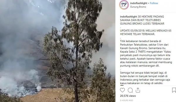 "30 hektare Padang Savana dan Bukit Teletubbies Gunung Bromo ludes terbakar. Titik kebakaran tersebut berada di Perbukitan Teletubbies, sekitar 5 km dari Kawah Gunung Bromo. Sementara itu, Kepala Seksi 2 TNBTS mengaktakan "Kalau penyebab pasti munculnya api belum kita ketahui pasti. Apakah karena faktor cuaca atau kelalaian manusia, semisal membuang puntung rokok sembarangan dll. Semoga hal serupa tidak terjadi lagi, di bulan-bulan ini banyak tempat indah di Indonesia yang terbakar dan semoga saja kasus kebakaran ini tetap di selidiki," demikian tulis Instagram @Indoflashlight, dikutip Senin (3/8/2018).