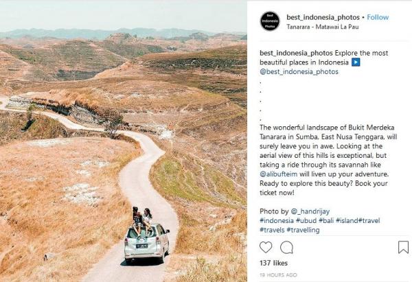 "Pemandangan indah Bukit Tanarara di Sumba, Nusa Tenggara Timur, pasti akan membuat Anda kagum. Melihat pemandangan perbukitan ini luar biasa, menaiki atas mobil sambil melihat hamparan savana seperti yang dilakukan @alibufteim akan menambah petualangan Anda. Siap untuk menjelajahi keindahan ini? Pesan tiketnya sekarang," tulis Instagram @best_indonesia_photos, dikutip Kamis (2/8/2018).
