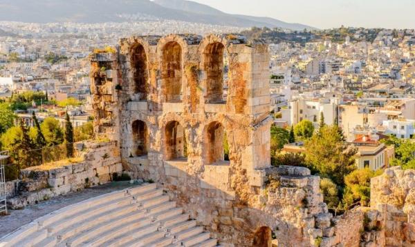 Melihat reruntuhan kuno di Athena, Yunani