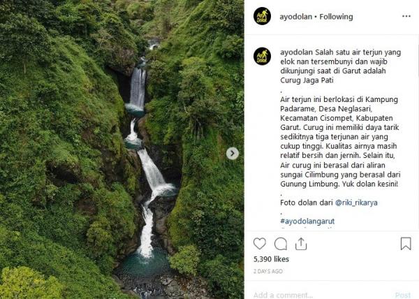 "Salah satu air terjun yang elok nan tersembunyi dan wajib dikunjungi saat di Garut adalah Curug Jaga Pati. Air terjun ini berlokasi di Kampung Padarame, Desa Neglasari, Kecamatan Cisompet, Kabupaten Garut. Curug ini memiliki daya tarik sedikitnya tiga terjunan air yang cukup tinggi. Kualitas airnya masih relatif bersih dan jernih. Selain itu, air curug ini berasal dari aliran Sungai Cilimbung yang berasal dari Gunung Limbung. Yuk, dolan ke sini!" tulis Instagram @ayodolan, dikutip Kamis (2/5/2019).