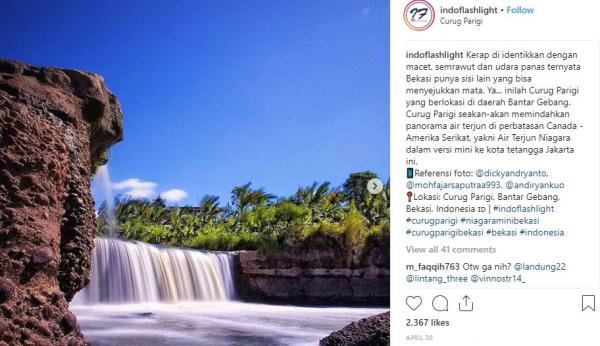 "Kerap diidentikkan dengan macet, semrawut dan udara panas, ternyata Bekasi punya sisi lain yang bisa menyejukkan mata. Ya... inilah Curug Parigi yang berlokasi di daerah Bantar Gebang. Curug Parigi seakan-akan memindahkan panorama air terjun di perbatasan Canada - Amerika Serikat, yakni Air Terjun Niagara dalam versi mini ke kota tetangga Jakarta ini," tulis Instagram @Indiflashlight, Rabu (8/5/2019).