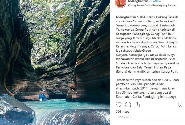 "Sudah tahu Cukang Taneuh atau Green Canyon di Pangandaran kan? Ternyata, kembarannya ada di Banten loh. Ya, namanya Curug Putri yang terletak di Kabupaten Pandeglang. Curug Putri bak surga yang tersembunyi. Meski lebih kecil, namun tak kalah eksotis dari Green Canyon. Karena saking miripnya, Curug Putri kerap juga disebut Little Green Canyon. Pandeglang rupanya tidak hanya menawarkan wisata laut di sekitaran Selat Sunda. Di sana ada hutan raya yang dikelola Perhutani dan Balai Taman Hutan Raya (Tahura) dan memiliki Air Terjun Curug Putri. Taman hutan raya sudah ada dari 2012, dan pembentukan balai pengelola baru diresmikan pada 2014. Dengan luas kira-kira 30 ribu hektare, hutan yang ada di Kecamatan Carita, Pandeglang ini rupanya memiliki objek alam yang indah. Ada tiga air terjun yaitu Curug Gendang, Cadas Ngampar dan Curug Putri yang bisa jadi tempat alternatif liburan selain pantai. Perjalanan ke tiga curug di Tahura sekitar 2 kilometer. Kamu akan melewati jalan setapak sembari menikmati pemandangan ciri khas hutan Pandeglang. Jika sedang beruntung, dari kejauhan akan terlihat beberapa monyet bergelantungan di atas pohon sebelum sampai ke Curug Gendeng atau Curug Putri," tulis Instagram @BolangBanten dikutip Senin (22/10/2018).