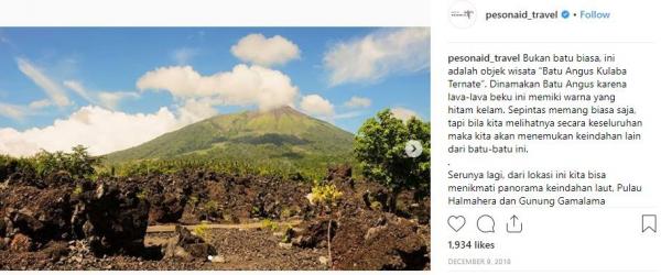 "Bukan batu biasa, ini adalah objek wisata Batu Angus Kulaba Ternate. Dinamakan Batu Angus karena lava-lava beku ini memiliki warna yang hitam kelam. Sepintas memang biasa saja, tapi bila kita melihatnya secara keseluruhan, maka kita akan menemukan keindahan lain dari batu-batu ini. Serunya lagi, dari lokasi ini kita bisa menikmati panorama keindahan laut, Pulau Halmahera dan Gunung Gamalama ditemani udara sejuk. Lengkap sudah bahagiamu Sobat! Nah, kalau mau liburan ke sini, sekalian sambangi destinasi sekitarnya!," tulis Instagram @Pesonaid_travel, Kamis (28/2/2019).