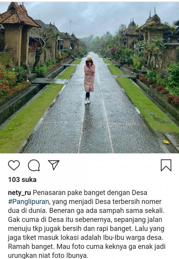 "Penasaran pake banget dengan Desa #Panglipuran, yang menjadi Desa terbersih nomer dua di dunia. Beneran ga ada sampah sama sekali. Gak cuma di Desa itu sebenernya, sepanjang jalan menuju tkp jugak bersih dan rapi banget. Lalu yang jaga tiket masuk lokasi adalah Ibu-Ibu warga desa. Ramah banget. Mau foto cuma keknya ga enak jadi urungkan niat foto Ibunya," tulis Instagram @nety_ru, dikutip Senin (30/3/2020).