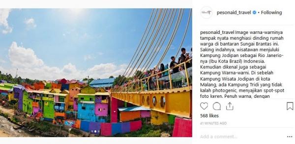 "Image warna-warninya tampak nyata menghiasi dinding rumah warga di bantaran Sungai Brantas ini. Saking indahnya, wisatawan menjuluki Kampung Jodipan sebagai Rio Janerio-nya (Ibu Kota Brasil) Indonesia. Kemudian dikenal juga sebagai Kampung Warna-warni. Di sebelah Kampung Wisata Jodipan di kota Malang, ada Kampung Tridi yang tidak kalah photogenic, menyajikan spot-spot foto keren. Penuh warna, dengan gambar-gambar 3 dimensi yang terlihat sangat nyata," tulis Instagram @Pesonaid_Travel, dikutip Senin (21/1/2019).