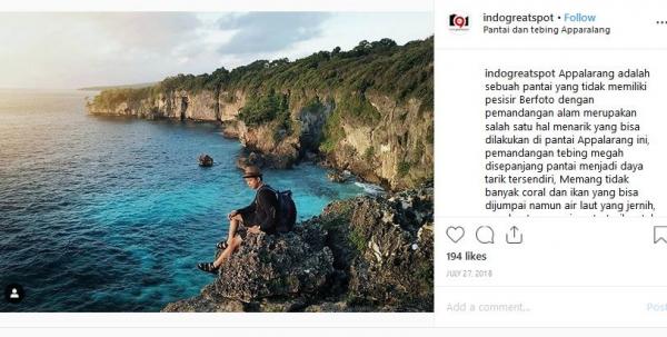 "Appalarang adalah sebuah pantai yang tidak memiliki pesisir. Berfoto dengan pemandangan alam merupakan salah satu hal menarik yang bisa dilakukan di pantai Appalarang ini, pemandangan tebing megah di sepanjang pantai menjadi daya tarik tersendiri, Memang tidak banyak coral dan ikan yang bisa dijumpai, namun air laut yang jernih, membuat pengunjung tertarik untuk sekadar berenang dan bermain air. Anda juga bisa memacu adrenalin dengan langsung terjun dari atas tebing, asal ombak tidak sedang tinggi - #IGS_SulawesiSelatan. Photo by : @alaric_a08," tulis Instagram @indogreatspot, dikutip Jumat (29/3/2019).