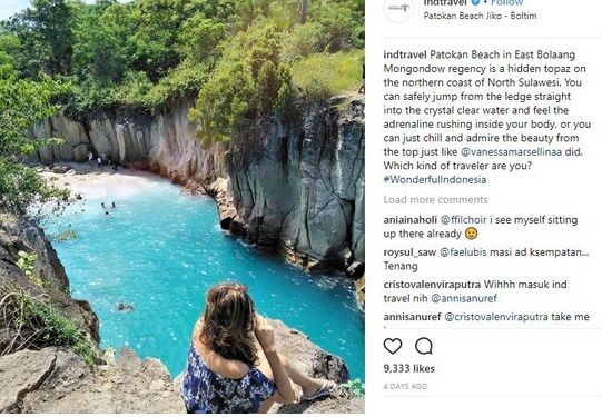 "Patokan Beach di Kabupaten Bolaang Mongondow Timur adalah topaz tersembunyi di pantai utara Sulawesi Utara. Anda dapat dengan aman melompat dari langkan lurus ke air jernih dan merasakan adrenalin mengalir deras di dalam tubuh atau hanya bersantai dan mengagumi keindahan dari atas seperti yang dilakukan oleh @vanessamarsellinaa. Pelancong jenis apa Anda? #WonderfulIndonesia," tulis Instagram Indtravel, dikutip Senin (19/11/2018).