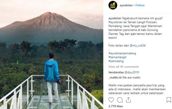 "Ngabuburit ke mana nih, guys? Ayo dolan ke Taman Langit Pulosari , Pemalang, Jawa Tengah! Menikmati keindahan panorama di kaki Gunung Slamet. Tag dan ajak teman kamu dolan ke sini!" tulis Instagram @ayodolan, Senin (13/5/2019).