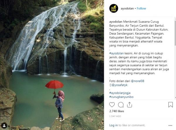 "Menikmati Suasana Curug Banyunibo, air terjun cantik dari Bantul. Tepatnya berada di Dusun Kabrukan Kulon, Desa Sendangsari, Kecamatan Pajangan, Kabupaten Bantul, Yogyakarta. Tempat wisata ini bisa menjadi alternatif wisata yang menyenangkan. Ayo dolan ke sini. Air di curug ini cukup jernih dengan aliran yang tidak begitu deras. Kamu juga bisa menikmati sejuknya suasana di sekitar air terjun sembari mendengarkan suara aliran air," tulis Instagram @ayodolan, dikutip Sabtu (6/4/2019).
