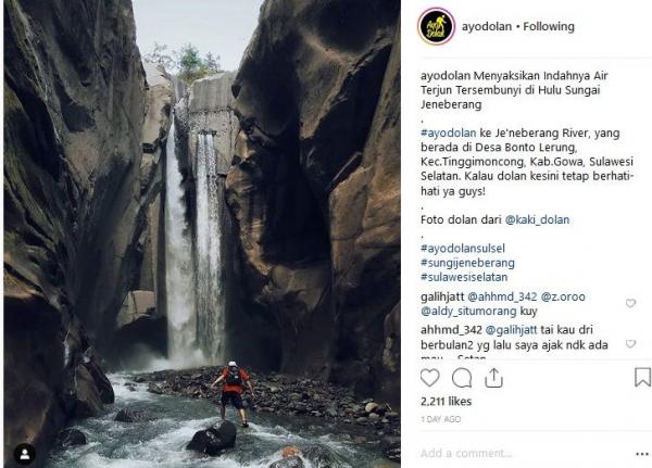 "Menyaksikan indahnya air terjun tersembunyi di hulu Sungai Jeneberang. #ayodolan ke Je'neberang River, yang berada di Desa Bonto Lerung, Kec.Tinggimoncong, Kab.Gowa, Sulawesi Selatan. Kalau dolan ke sini tetap berhati-hati ya guys! Foto dolan dari @kaki_dolan," tulis Instagram @ayodolan, dikutip Kamis (21/3/2019).