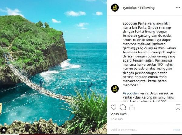 "Pantai yang memiliki nama lain Pantai Sinden ini mirip dengan Pantai Timang dengan jembatan gantung dan Gondola. Selain itu, di sini kamu juga dapat mencoba melewati jembatan gantung yang cukup ekstrem. Sebab Jembatan tersebut menghubungkan daratan dengan pulau karang yang ada di tengah lautan. Panjangnya memang hanya sekitar 100 meter, namun berada di atas ketinggian dengan pemandangan bawah berupa deburan ombak yang menantang nyali kamu. berani mencoba?" tulis Instagram @ayodolan, dikutip Minggu (31/3/2019).