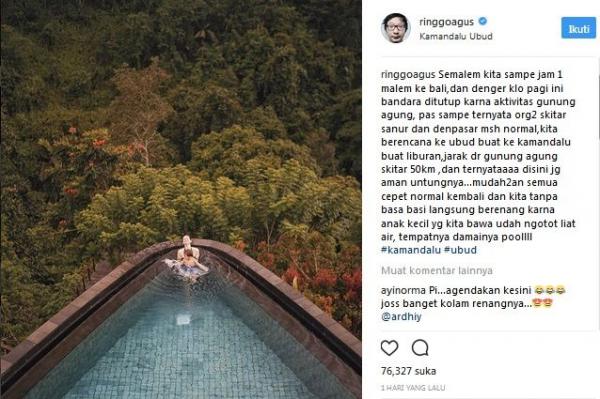 JAKARTA, iNews.id – Saat ini masyarakat tertuju dengan situasi erupsi Gunung Agung, Bali. Meski begitu, tidak mematahkan semangat Ringgo Agus Rahman untuk berlibur ke Bali.