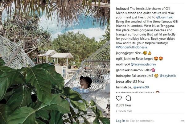 "Pesona yang tak tertahankan. Alam eksotis dan tenang Gili Meno akan mengendurkan pikiran. Pulau terkecil di antara tiga Kepulauan Gili yang terkenal di Lombok, Nusa Tenggara Barat, tempat ini menawarkan pantai-pantai cantik dan sekitarnya tenang yang cocok untuk liburan. Pesan tiket sekarang dan penuhi fantasi tropis Anda!," tulis Instagram Indtravel seperti dikutip iNews.id, Sabtu (12/5/2018).