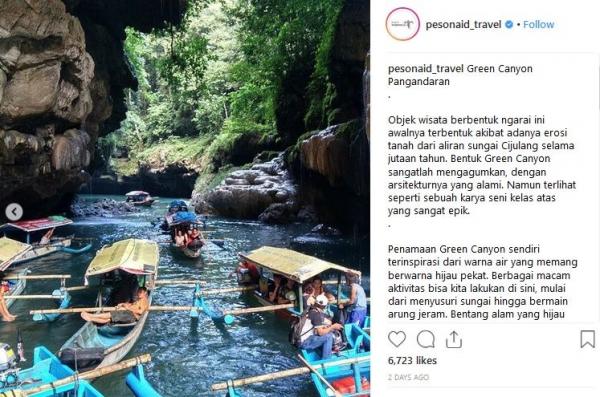 "Green Canyon Pangandaran. Objek wisata berbentuk ngarai ini awalnya terbentuk akibat adanya erosi tanah dari aliran Sungai Cijulang selama jutaan tahun. Bentuk Green Canyon sangatlah mengagumkan, dengan arsitekturnya yang alami. Namun terlihat seperti sebuah karya seni kelas atas yang sangat epik. Penamaan Green Canyon sendiri terinspirasi dari warna air yang memang berwarna hijau pekat. Berbagai macam aktivitas bisa kita lakukan di sini, mulai dari menyusuri sungai hingga bermain arung jeram. Bentang alam yang hijau eksotis juga mampu menyejukkan mata siapa saja yang melihatnya. Yuk, rencanakan perjalanan kalian ke Pangandaran, Jawa Barat!," tulis Instagram @Pesonaid_Travel dikutip Kamis (17/1/2019).
