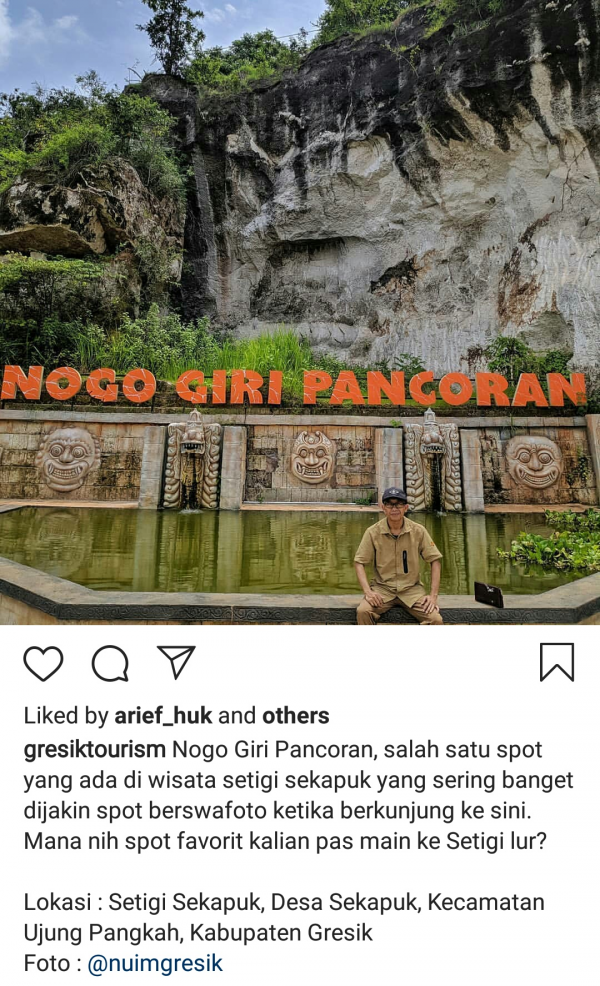 "Nogo Giri Pancoran, salah satu spot yang ada di wisata setigi sekapuk yang sering banget dijadikan spot berswafoto ketika berkunjung ke sini. Mana nih spot favorit kalian pas main ke Setigi lur? Foto : @nuimgresik," tulis Instagram @gresiktourism, dikutip Rabu (17/3/2020).