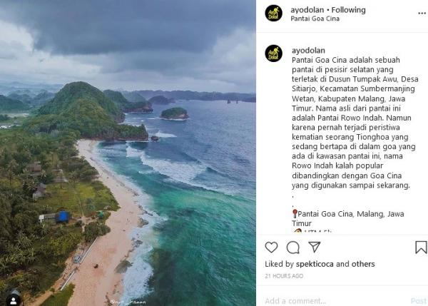 "Pantai Goa Cina adalah pantai di pesisir selatan yang terletak di Dusun Tumpak Awu, Desa Sitiarjo, Kecamatan Sumbermanjing Wetan, Kabupaten Malang, Jawa Timur. Nama asli dari pantai ini adalah Pantai Rowo Indah. Namun karena pernah terjadi peristiwa kematian seorang Tionghoa yang sedang bertapa di dalam goa yang ada di kawasan pantai ini, nama Rowo Indah kalah popular dibandingkan dengan Goa Cina yang digunakan sampai sekarang," tulis Instagram @ayodolan, dikutip Senin (17/2/2020).