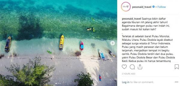 "Saatnya bikin daftar agenda liburan nih jelang akhir tahun! Bagaimana dengan pulau nan indah ini, sudah masuk list kalian kah? Terletak di sebelah barat Pulau Morotai, Maluku Utara. Pulau Dodola layak disebut sebagai surga wisata di Timur Indonesia. Pulau yang masih perawan dan belum terjamah, menjadikan tempat ini begitu cantik. Pulau Dodola terdiri dari dua pulau, yakni Pulau Dodola Besar dan Pulau Dodola Kecil. Kedua pulau ini hanya tersambung saat laut sedang surut dan membentuk jalan pasir. Sungguh unik, bukan? Serunya lagi, di pulau ini juga menyimpan harta karun sisa Perang Dunia II di dasar Pulau Dodola," tulis Instagram Pesonaid_Travel, dikutip Jumat (30/11/2018).