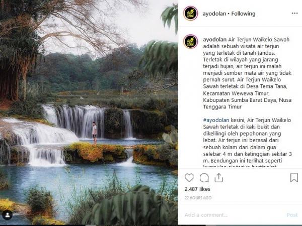 "Air Terjun Waikelo Sawah adalah wisata air terjun yang terletak di tanah tandus. Terletak di wilayah yang jarang terjadi hujan, air terjun ini malah menjadi sumber mata air yang tidak pernah surut. Air Terjun Waikelo Sawah terletak di Desa Tema Tana, Kecamatan Wewewa Timur, Kabupaten Sumba Barat Daya, Nusa Tenggara Timur. #ayodolan ke sini, Air Terjun Waikelo Sawah terletak di kaki bukit dan dikelilingi oleh pepohonan yang lebat. Air terjun ini berasal dari kolam dalam gua selebar 4 m dan ketinggian sekitar 3 m. Bendungan ini terlihat seperti kumpulan air terjun bertingkat dengan masing-masing kolam di bawahnya. Wah! Indah bukan? Tag dan ajak teman kamu dolan ke sini! Foto dolan dari @riduwanaguss," tulis Instagram @ayodolan, dikutip Selasa (29/10/2019).