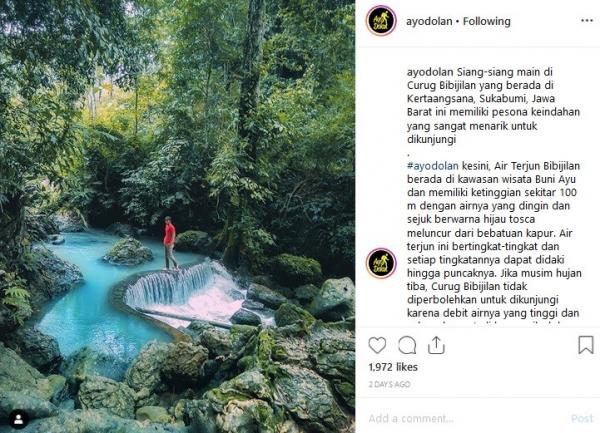 "Siang-siang main di Curug Bibijilan! Curug yang berada di Kertaangsana, Sukabumi, Jawa Barat ini memiliki pesona keindahan yang sangat menarik untuk dikunjungi. Berada di kawasan wisata Buni Ayu, curug ini memiliki ketinggian sekitar 100 meter. Airnya dingin dan sejuk, berwarna hijau tosca yang meluncur dari bebatuan kapur. Air terjun ini bertingkat-tingkat dan setiap tingkatannya dapat didaki hingga puncaknya. Jika musim hujan tiba, Curug Bibijilan tidak diperbolehkan untuk dikunjungi, karena debit airnya tinggi dan cukup deras. Jadi, kapan dolan ke sini?" tulis Instagram @ayodolan, dikutip Sabtu (11/5/2019).