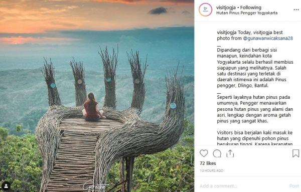 "Dipandang dari berbagi sisi manapun, keindahan Kota Yogyakarta selalu berhasil membius siapapun yang melihatnya. Salah satu destinasi yang terletak di daerah istimewa ini adalah Pinus pengger, Dlingo, Bantul. Seperti layaknya hutan pinus pada umumnya, Pengger menawarkan pesona hutan pinus yang alami dan asri, lengkap dengan aroma getah pinus yang sangat khas. Visitors bisa berjalan kaki masuk ke hutan yang dipenuhi pohon pinus berukuran tinggi. Karena kerapatan dan ketinggian pohonnya, suasana di sini terasa sangat teduh, bahkan di beberapa titik agak gelap karena cahaya matahari tidak bisa menembus masuk hingga ke bawah. Selain menikmati kesegaran dan keindahan hutan pinus, visitors yang berkunjung ke Pengger juga bisa berswafoto di beberapa lokasi menarik dan instagramable. Lokasi tersebut antara lain berupa rumah pohon, jembatan kayu dari pohon ke pohon, instalasi seni berupa tangan raksasa dari jalinan kayu, serta lubang raksasa yang menghadap ke arah Kota Yogya," tulis Instagram @visitjogja, dikutip Selasa (2/4/2019).