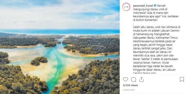 "Pernah mengunjungi danau unik di Indonesia? Ada di mana dan keunikannya apa saja? Yuk, ceritakan di kolom komentar! Fenomena Labuan Cermin ini diperkirakan terjadi karena adanya celah yang menyebabkan air laut menerobos masuk saat pasang. Kehidupan biota di dalam danau pun ikut menyesuaikan diri dengan lingkungan. Selain danau yang begitu indah, di sekitarnya juga terdapat pepohonan rindang yang membuat suasana liburan jadi makin tenang dan damai," tulis Instagram @pesonaid_travel, Senin (15/7/2019).