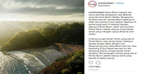 "Uniknya sungai bawah tanah yang ada di Pantai Baron, rasa airnya tawar meskipun berada sangat dekat dengan laut. Pengunjung yang tidak berani bermain atau berenang di laut dapat bermain air dan berenang di aliran sungai bawah tanah tersebut. Pemandangan lainnya yang ada di Pantai Baron adalah adanya bukit yang berada di sekitar pantai. Sahabat dapat menikmati keindahan pantai dari atas bukit tersebut, jika sore hari maka akan terlihat sunset yang sangat indah. Tiket masuk hanya Rp10.000 per orang. Selamat berkunjung."