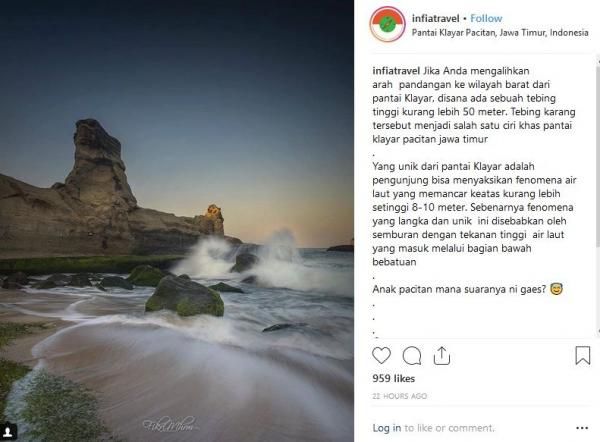 "Jika Anda mengalihkan arah pandangan ke wilayah barat dari Pantai Klayar, di sana ada tebing tinggi kurang lebih 50 meter. Tebing karang tersebut menjadi salah satu ciri khas Pantai Klayar pacitan Jawa Timur. Yang unik dari pantai Klayar adalah pengunjung bisa menyaksikan fenomena air laut yang memancar ke atas kurang lebih setinggi 8-10 meter. Sebenarnya fenomena yang langka dan unik ini disebabkan oleh semburan dengan tekanan tinggi air laut yang masuk melalui bagian bawah bebatuan. Anak pacitan mana suaranya ni gaes?," tulis Instagram @Infiatravel, dikutip Kamis (1/10/2018).