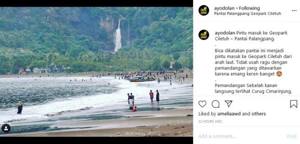 "Bisa dikatakan pantai ini menjadi pintu masuk ke Geopark Ciletuh dari arah laut. Tidak usah ragu dengan pemandangan yang ditawarkan karena emang keren banget. Pemandangan sebelah kanan langsung terlihat Curug Cimarinjung, curug yang paling dekat dengan pantai Palangpang. Di sekitar Pantai Palangpang ini banyak sekali villa yang modelnya juga unik. Yang jelas kalau kalian ke sini dalam keadaan santai, tidak terburu-buru karena sayang sekali kalau tidak menikmati liburannya dengan santai. Pantai Palangpang, Sukabumi, Jawa Barat. Foto dolan dari @otama.travel," tulis Instagram @ayodolan, dikutip Senin (15/6/2020).
