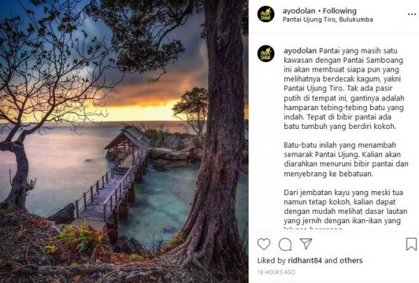 "Pantai yang masih satu kawasan dengan Pantai Samboang ini akan membuat siapa pun yang melihatnya berdecak kagum, yakni Pantai Ujung Tiro. Tak ada pasir putih di tempat ini, gantinya adalah hamparan tebing-tebing batu yang indah. Tepat di bibir pantai ada batu tumbuh yang berdiri kokoh," tulis Instagram @ayodolan, dikutip Jumat (27/12/2019).