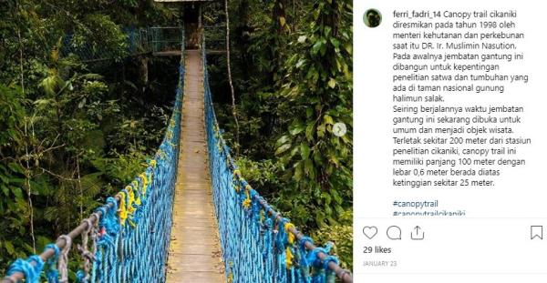 "Pada awalnya jembatan gantung ini dibangun untuk kepentingan penelitian satwa dan tumbuhan yang ada di taman nasional gunung halimun salak. Seiring berjalannya waktu jembatan gantung ini sekarang dibuka untuk umum dan menjadi objek wisata. Terletak sekitar 200 meter dari stasiun penelitian cikaniki, canopy trail ini memiliki panjang 100 meter dengan lebar 0,6 meter berada diatas ketinggian sekitar 25 meter," tulis Instagram @ferri_fadri_14, dikutip Rabu (21/8/2019).