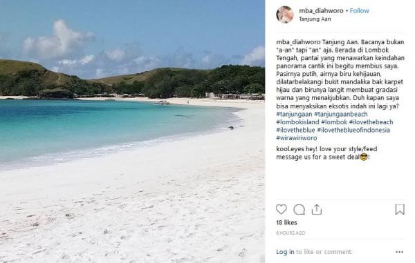 "Tanjung Aan. Bacanya bukan 'a-an' tapi 'an' aja. Berada di Lombok Tengah, pantai yang menawarkan keindahan panorama cantik ini begitu membius saya. Pasirnya putih, airnya biru kehijauan, dilatarbelakangi Bukit Mandalika bak karpet hijau dan birunya langit membuat gradasi warna yang menakjubkan. Duh kapan saya bisa menyaksikan eksotis indah ini lagi ya?," tulis Instagram @mba_diahworo, dikutip Rabu (16/1/2019).