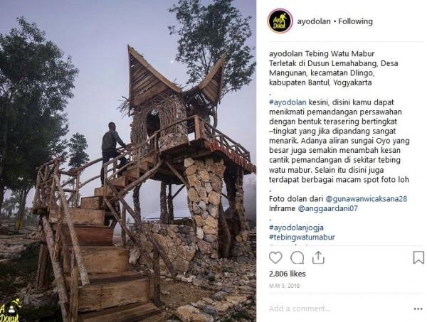 "Tebing Watu Mabur. Terletak di Dusun Lemahabang, Desa Mangunan, Kecamatan Dlingo, kabupaten Bantul, Yogyakarta. #ayodolan ke sini, di sini kamu dapat menikmati pemandangan persawahan dengan bentuk terasering bertingkat-tingkat yang jika dipandang sangat menarik. Adanya aliran sungai Oyo yang besar juga semakin menambah kesan cantik pemandangan di sekitar tebing Watu Mabur. Selain itu, di sini juga terdapat berbagai macam spot foto loh. Foto dolan dari @gunawanwicaksana28, Inframe @anggaardani07," tulis Instagram @ayodolan, dikutip Sabtu (9/2/2019).