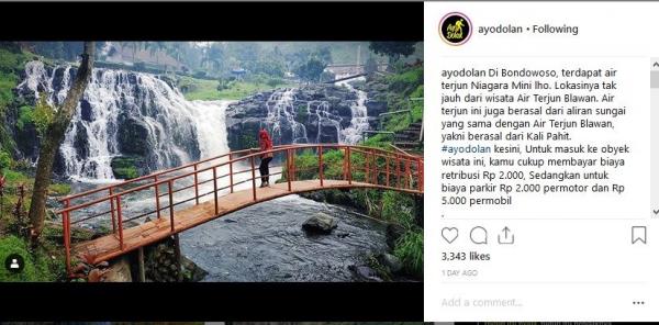 "Di Bondowoso, terdapat air terjun Niagara Mini lho. Lokasinya tak jauh dari wisata Air Terjun Blawan. Air terjun ini juga berasal dari aliran sungai yang sama dengan Air Terjun Blawan, yakni berasal dari Kali Pahit. #ayodolan ke sini, untuk masuk ke objek wisata ini, kamu cukup membayar biaya retribusi Rp2.000, sedangkan untuk biaya parkir Rp2.000 per motor dan Rp5.000 per mobil. Foto dolan dari @20hasanah," tulis Instagram @ayodolan, dikutip Selasa (26/2/2019).